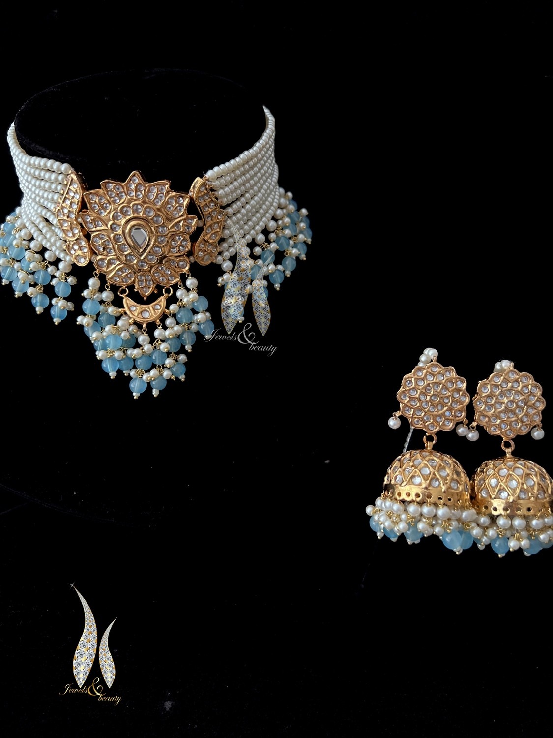 Gold plated kundan choker with medium size jhumki earrings. Perfect jewellery for any occasion.