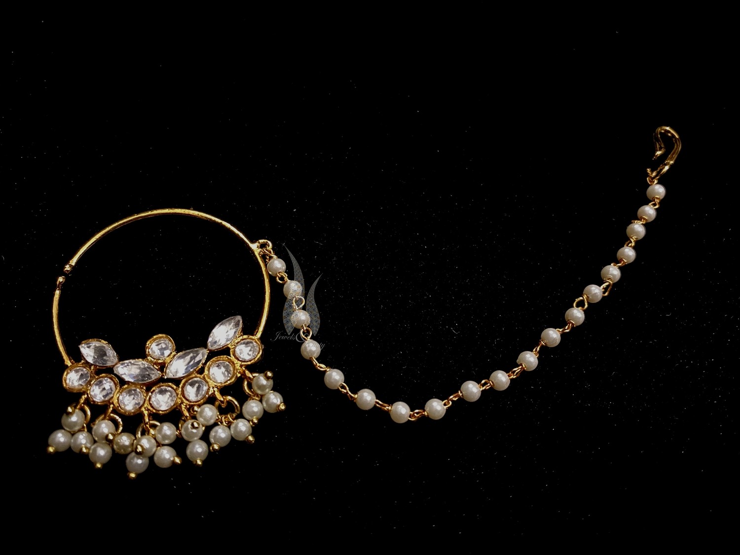 The nose ring is studded with Ahmadabadi kundan with pearl moti string stones.