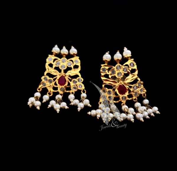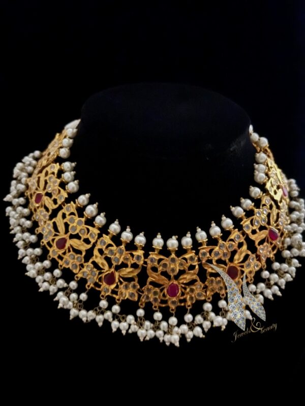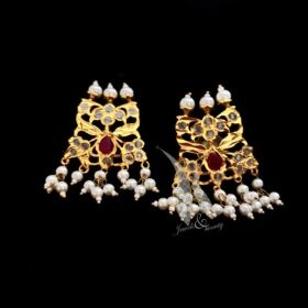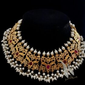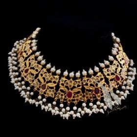 The gold plated necklace has an adjustable strap at the back. The set is made with Brass, copper, nickel, aluminium and German silver. Pair it with aheavy saree, lengha and suit.