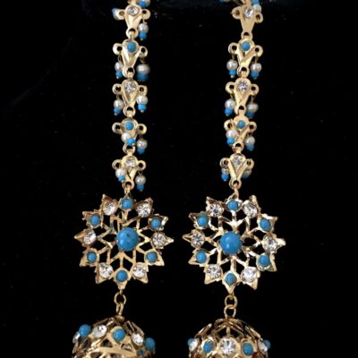 The gold plated necklace has an adjustable strap at the back. The set is made with Brass, copper, nickel, aluminium and German silver. Pair it with aheavy saree, lengha and suit.