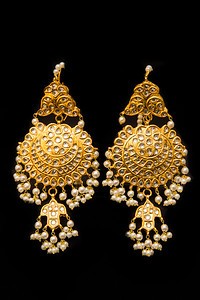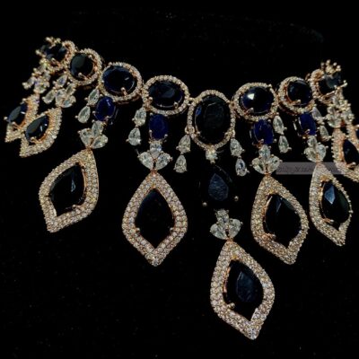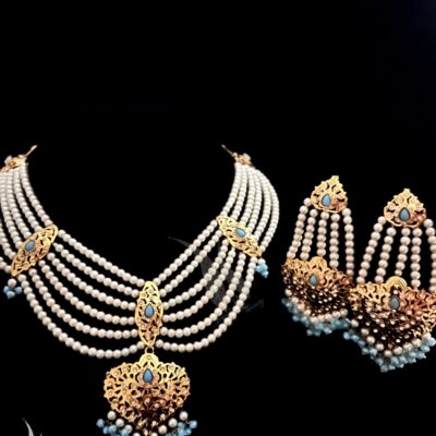 Gold plated hyderabadi chandballi collar neclace set. The set is in green and white combination.