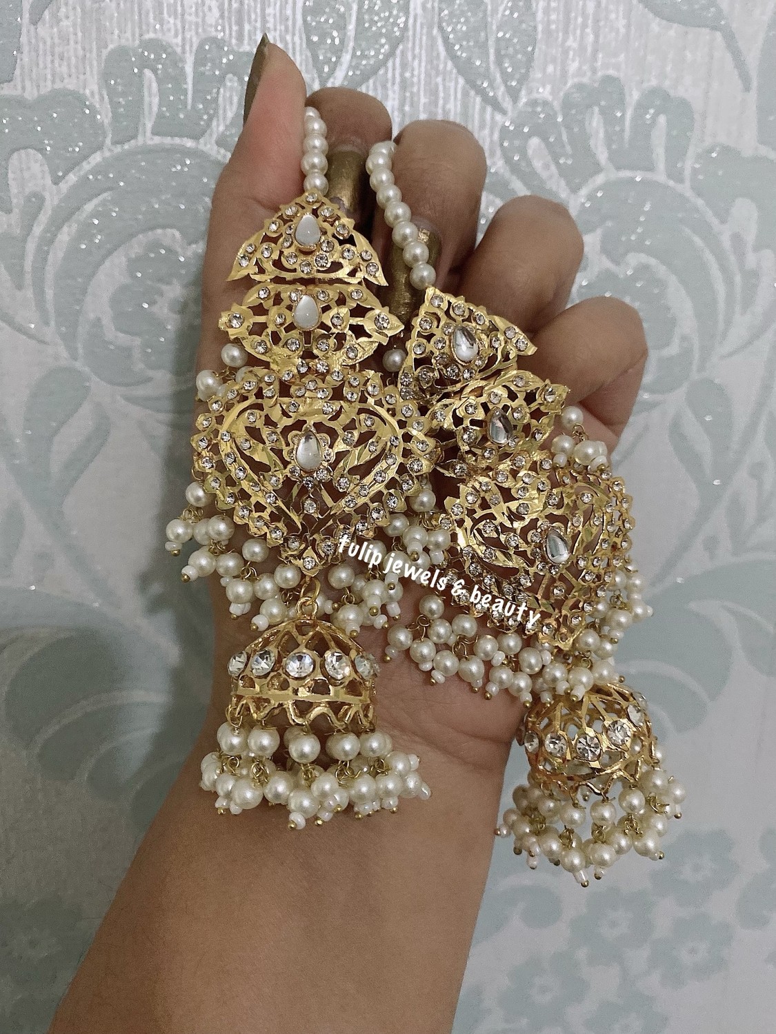 Maiza Hyderabadi Jhumka Earrings. Beautiful statement jhumka earrings. Fully handcrafted with CZ clear stones, pearls.