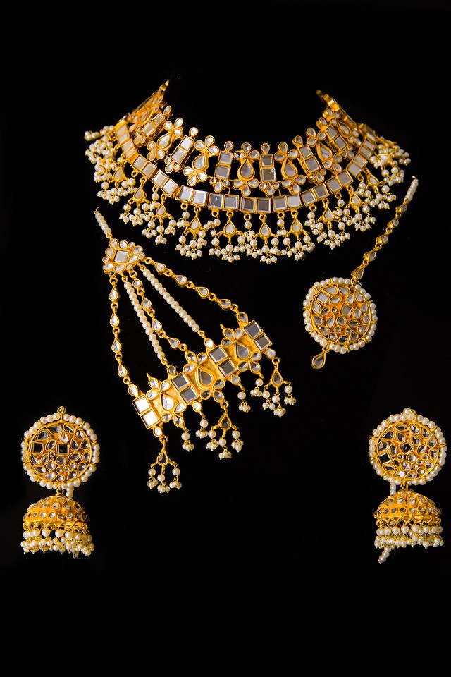 Stunning Gold plated bridal jewellery set. Set is handcrafted with mirrors and pearls. This set includes necklace, jhumki, tikka and jhummar.