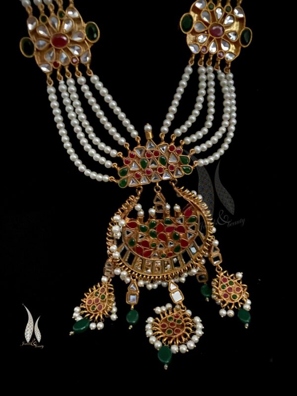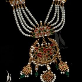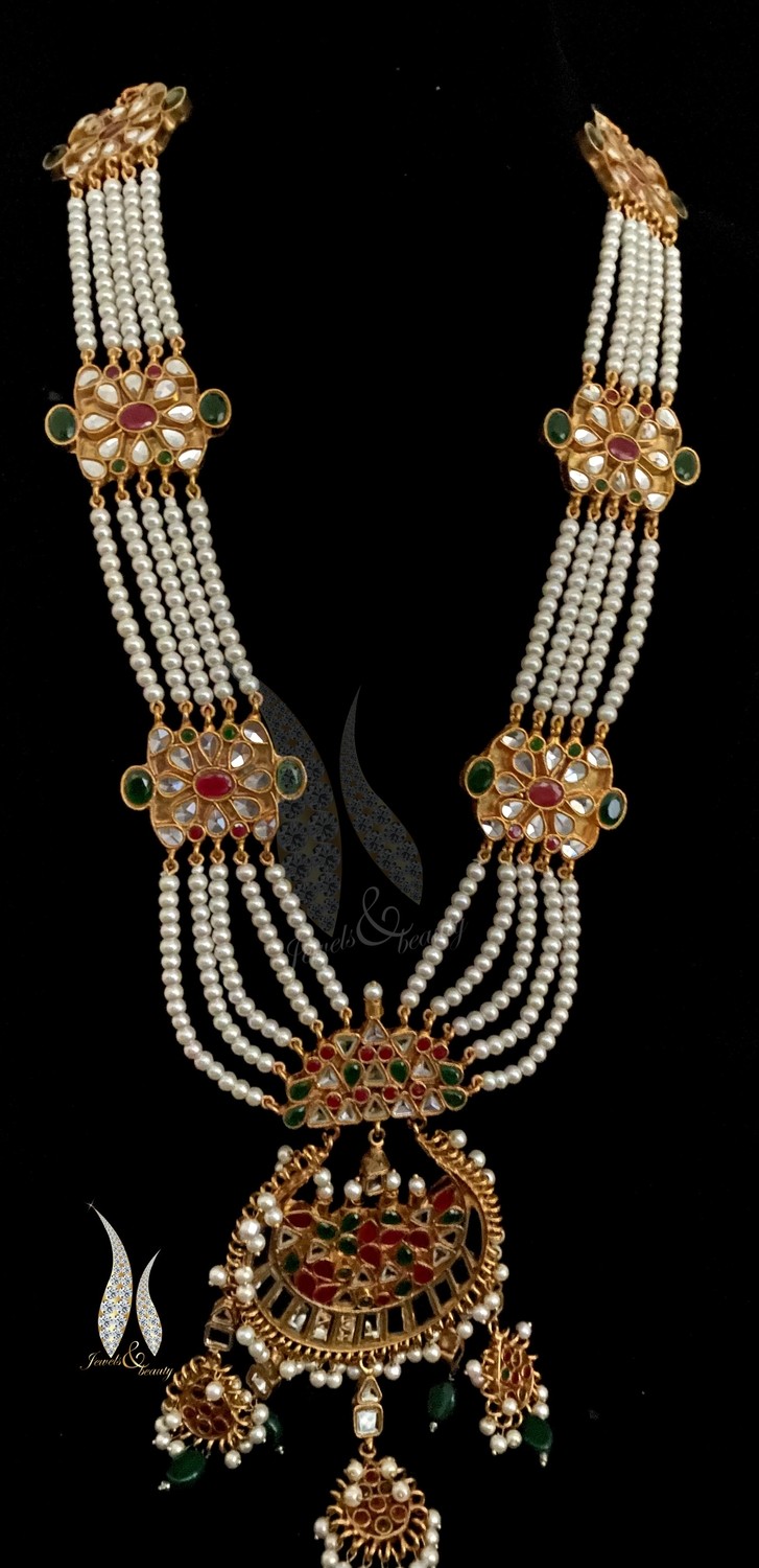 Nagina rani haar is created with semi precious stones in perfect motifs with dangling pearl drops and beads.
