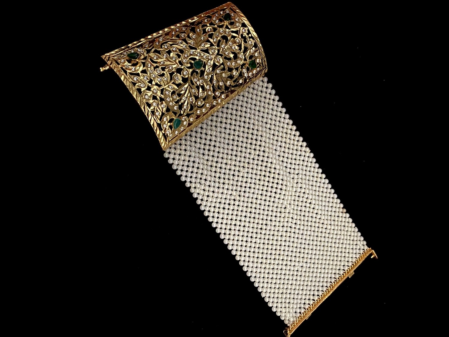 Ramz hand bracelet. Gold plated on high quality brass as bae metal. A beautiful ari hand piece exquisitely crafted with emerald stones and white pearl moti.